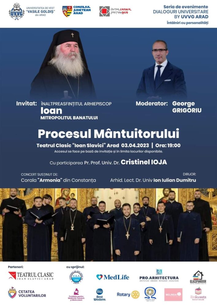 Luni seara, 3 aprilie 2023, la Teatrul Clasic „Ioan Slavici” din Arad, în cadrul seriei de evenimente Dialoguri universitare by UVVG Arad. Întâlniri cu personalități, a avut loc conferința publică, de excepție, Procesul Mântuitorului, susținută de către Înaltpreasfințitul Părinte Arhiepiscop Ioan, Mitropolitul Banatului, cu participarea Părintelui Decan al Facultății de Teologie Ortodoxă „Ilarion V. Felea” din Arad, Prof. Univ. Dr. Cristinel Ioja.